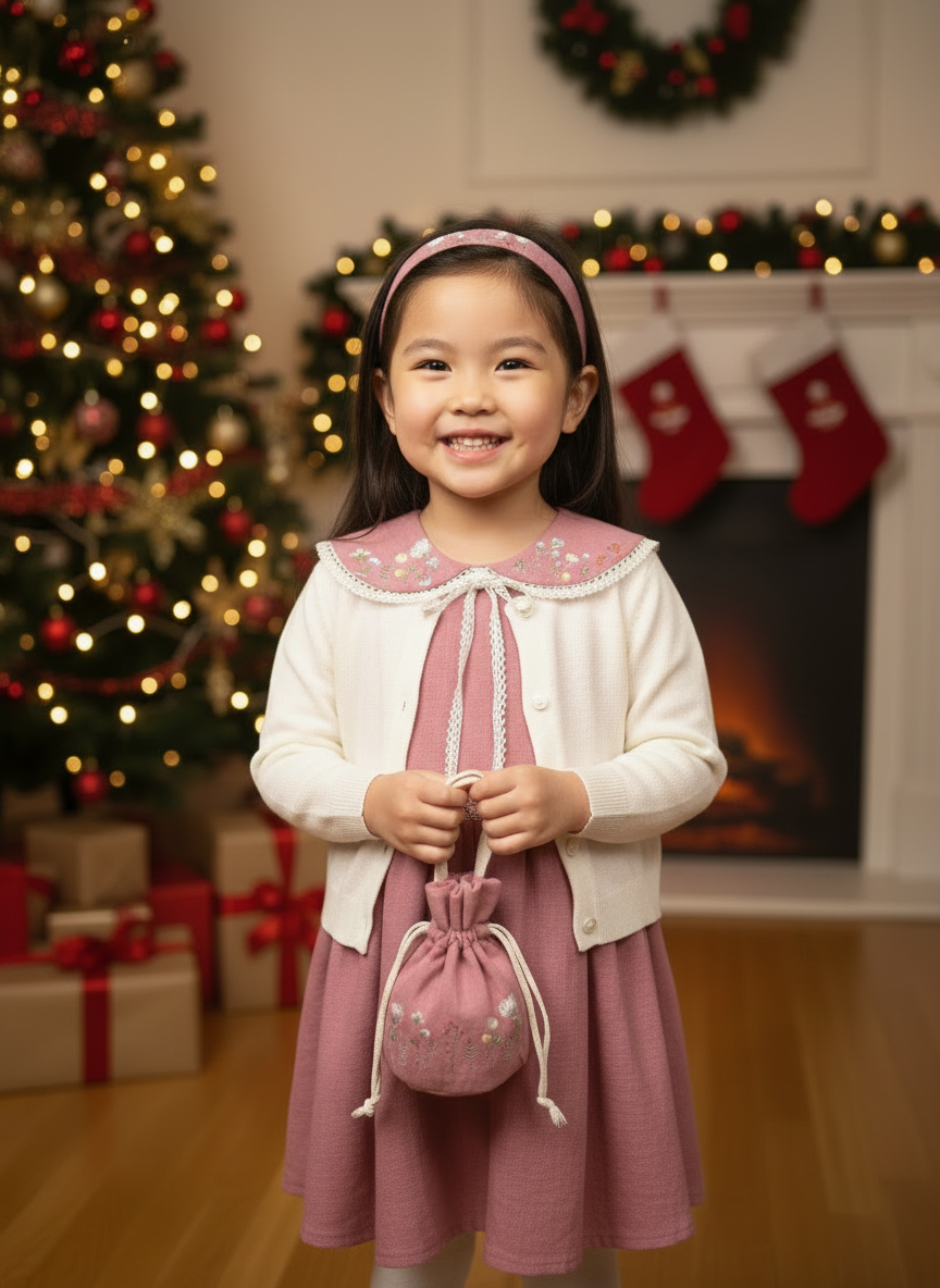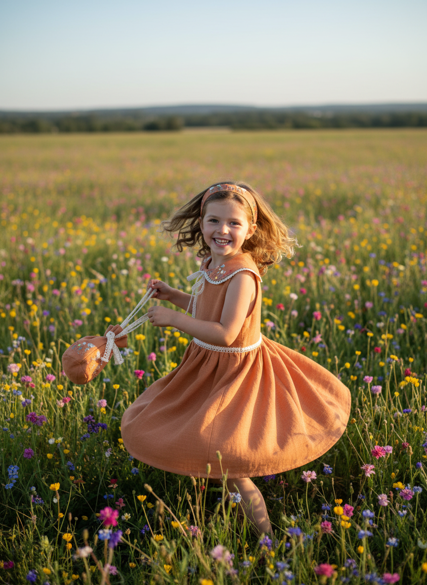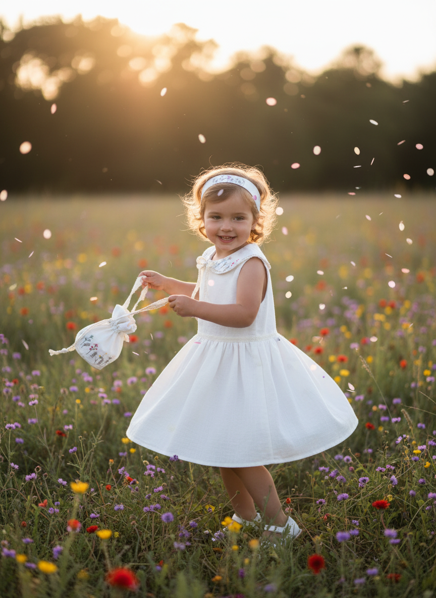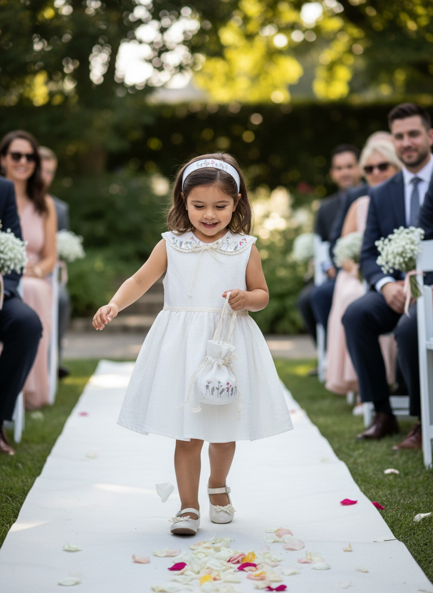 Ein liebevoll gestaltetes Kinderkleid-Set aus Baumwoll-Leinen-Mix mit feinen Stickereien, bestehend aus einem Kleid, einem bestickten abnehmbaren Kragen, einem passenden Stirnband und einer kleinen Tasche. Zeitlos, hochwertig und ideal für festliche Anlässe.