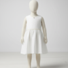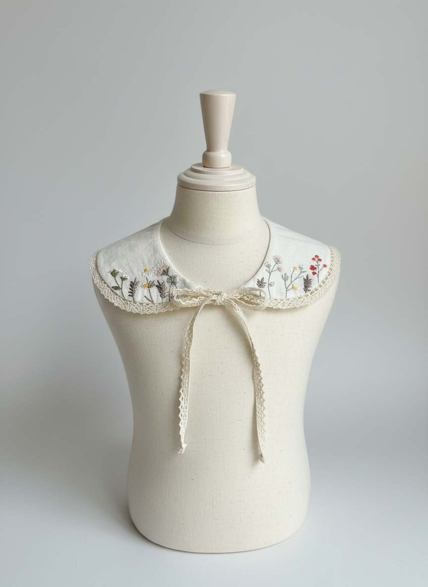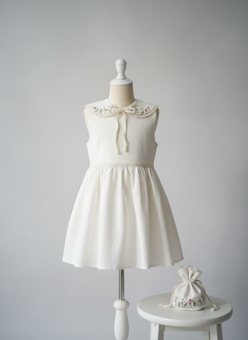 Ein liebevoll gestaltetes Kinderkleid-Set aus Baumwoll-Leinen-Mix mit feinen Stickereien, bestehend aus einem Kleid, einem bestickten abnehmbaren Kragen, einem passenden Stirnband und einer kleinen Tasche. Zeitlos, hochwertig und ideal für festliche Anlässe.